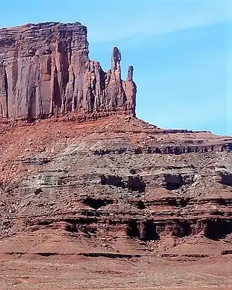 Chip and Dale Towers are two 300-foot (91-meter) tall sandstone towers located in the Island in the Sky District of Canyonlands National Park, in San Juan County, Utah. Dale Tower rises to an elevation of 5,620 feet (1,710 meters), whereas the lower Chip Tower is 5,420-feet. Airport Tower is set 2.5 mi (4.0 km) to the southwest, and Dead Horse Point State Park overlook is situated 4.5 mi (7.2 km) to the north-northeast. Chip and Dale Towers are an eroded fin composed of hard, fine-grained Wingate Sandstone, which is the remains of wind-borne sand dunes deposited approximately 200 million years ago in the Late Triassic. This Wingate Sandstone overlays a softer layer of the Chinle Formation. Access to the towers is via the four-wheel drive White Rim Road, and a scramble to reach the base.[3] The top of the towers rise over 1,000 feet above the road in approximately one-half mile. Precipitation runoff from Chip and Dale Towers drains east to the nearby Colorado River.