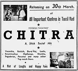 Chitra was launched in 1945, soon after World War II ended.[1] Directed by Wahab Kashmiri, it was produced by T. R. Sundaram under the banner of Modern Theatres, with K. L. V. Vasantha, T. S. Balaiah, T. S. Durairaj, K. K. Perumal, M. E. Madhavan and V. S. Susheela as the lead actors.[2][1] The film's final length was 10,569 feet (3,221 m).[2]