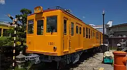 On 26 April 2007, DeHa 1001 was returned to service repainted into a sky blue promotional livery sponsored by game manufacturer Hudson Soft in connection with the 20th anniversary of the Momotaro Dentetsu game series in 2008.[4][5] DeHa 1001 made its last run in "Momotaro Dentetsu" livery on 15 May 2012 before undergoing overhaul and repainting.[5] On 11 August 2012, this unit was publicly unveiled in its all-over yellow livery formerly carried when it operated on the TRTA Ginza Line.[6] It was returned to revenue service in this livery on 16 August.[6] From January 2013, the original TRTA numbering (2046) was added to the Choshi-end of the car.[7] In February 2016, car 1001 received a red roof, more closely resembling the livery carried by the Ginza Line TRTA 2000 series trains.[8] The car was finally withdrawn following its last day in service on 28 February 2016.[9] In March 2016, it was transported by road to the Showa no Mori Museum in Matsudo, Chiba.[9]