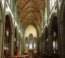 Funds were just sufficient to construct the nave, narthex and the lower portions of the northwest and southwest towers only. Vaulting was of brick rather than stone, and was flattened by two feet to reduce costs. The organ from the previous building was rebuilt on top of temporary vestries in the south-east corner of the nave. The east end of the nave was closed with a temporary wooden wall, and this much was consecrated on September 28, 1929. Winston Churchill visited the site several weeks earlier, on September 9, 1929, and was quick to help when the superintendent asked him to lay a stone on the north tower.[5]