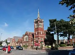 This church was built in 1910 from designs by George Baines (1852–1934) for the Congregational Union in a perpendicular style using a greek cross floorplan. It features a tall, square tower in the south-west corner and has attached church rooms to the north. Its bulk materials were red brick, stone, white brick and terracotta dressings with coloured tile roofs.[2]