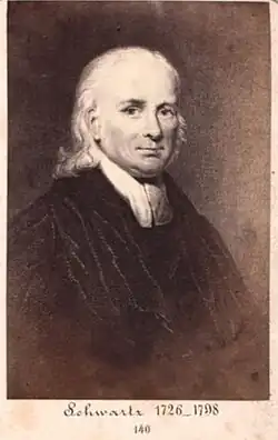 Christian Frederick Schwarz (with spellings including Friedrich and Schwartz or Swartz) (8 October 1726 – 13 February 1798) was a German Lutheran missionary to India. He was known for his linguistic skills, with knowledge of Latin, Greek, Hebrew, Sanskrit, Tamil, Urdu, Persian, Marathi, and Telugu and worked with the British to serve as an emissary of peace and sent to the court of Haider Ali in Mysore.[1] He worked alongside the Indian royal families, tutoring the Raja Serfoji of Tanjore, and was influential in establishing Protestant Christianity in southern India.[2]