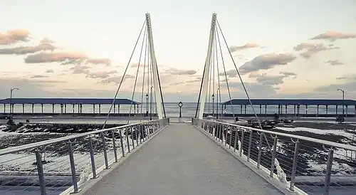 The Christine and John Markey Memorial Pedestrian Bridge is a steel cable stayed pedestrian bridge in Revere, Massachusetts. It was built as part of the Revere Transit Facility and Streetscape Project and opened in 2013. The bridge connects the Wonderland rapid transit and bus station and parking garage with Revere Beach over Ocean Avenue.[2]