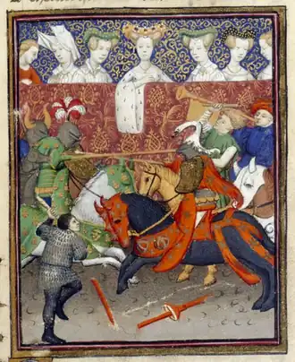 Detail of a miniature of ladies watching knights jousting, illustrating 'Le Duc des vrais amants', from a collection of works presented in 1414 by Christine to Isabeau of Bavaria.[10]