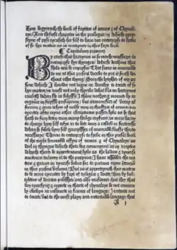 Page 1 of The Book of Feats of Arms and of Chivalry. Translated into English and printed in 1489 by William Caxton.