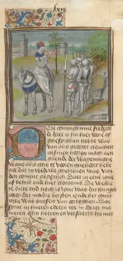 A Dutch edition of Le Livre de la cité des dames exists from the 15th century.[64] In 1521 The Book of the City of Ladies was published in English.[64] Livre des fais d'armes et de chevalerie was translated into English by William Caxton for Henry VII in 1489 and was published under the title The Book of Feats of Arms and of Chivalry as print one year later,[69] attributing Christine as author.[67] English editions of The Book of the City of Ladies and Livre du corps de policie (The Book of the Body Politic) were printed in 1521 without referencing Christine as the author. Elizabeth I had in her court library copies of The Book of the City of Ladies, L'Épistre de Othéa a Hector (Letter of Othea to Hector) and The Book of Feats of Arms and of Chivalry. Among the possessions of the English queen were tapestries with scenes from the City of Ladies.[70]