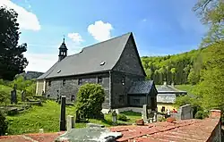 The village of Kryštofovo Údolí is protected as a village monument zone for a preserved set of folk architecture, consisting of multi-story houses with a timbered ground floor and half-timbered floor.[7] The landmark and the most valuable monument is the wooden Church of Saint Christopher. It was built in the early Baroque style in 1683–1684. It is one of the few preserved timbered building with slate cladding. The walls and ceiling of the church are decorated with fifteen paintings from the life of Christ. Next to the church are wooden bell tower and mortuary, and a Baroque rectory from 1786.[8]