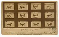 Chronophotography's original purpose was to help scientists study objects in motion, primarily humans and animals.[2] It was also used for practical purposes, such as judging timed events and recording historical ones (horse and dog races, performances) and studying the movement of projectiles for war.[12][11] With Anschutz's development of non-scientific, entertaining chronophotographs, chronophotography became the basis for the invention and development of cinematography.[11] Due to the development of projection devices (Muybridge's zoopraxiscope, Anschutz's electrotachyscope, and ultimately, Albert Londe's high-speed multi-exposure camera which ran film through a projector in a new way), the display of chronophotographs as entertainment became more sophisticated and useful than ever before.[11] Before long, cinematic devices spawned from original chronophotographic predecessors, with which audiences could watch continuous loops of entertaining activities (for example, the “peep show” devices built using Thomas Edison’s backlighting technology).[12] From these developments in history, cinematography and silent film of moving images were invented.
