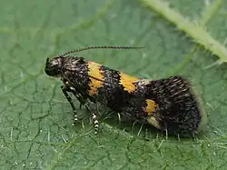 The wingspan is 8–10 mm. The head is metallic brassy-grey. Forewings are dark purplish-grey, mixed with black, with some whitish scales; a yellow subdorsal spot in the middle, and a smaller one in disc posteriorly; an ill-defined ochreous-white tornal spot, and another on costa at 3/4. Hindwings are grey. The larva is yellow-whitish; dorsal line brownish; lateral line of orange -reddish spots; head pale brown; plate of 2 blackish.[2][3][4][5]