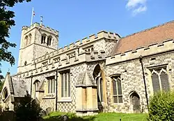 The Church of All Saints, Houghton Regis, Bedfordshire, is a medieval Grade I listed building. Characterised by flint and clunch checker work on the exterior, the church dates predominantly from the 13th and 14th centuries, with 15th century additions. All Saints' serves as the Parish Church for Houghton Regis, the parish including the town, parts of North Dunstable, Bidwell West, Thorn, and Linmere, as well as the hamlet of Sewell.[1]