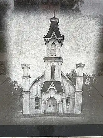 The Carpenter Gothic church was built in 1880 for Perry's Church of Christ congregation, which formed in 1837. The one-story wooden building with board-and-batten siding had a limestone foundation.[2] The front facade featured a three-section steeple and chimneys at the two corners; the steeple consisted of a tower with arched windows, a lantern with louvered windows, and a spire atop a mansard roof. The Gothic arched front entrance to the church was located at the base of the tower.[2] Arched stained glass windows with floral and geometric patterns were located on either side of the entrance.[3]