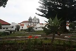 The church is situated to the left of the Praceta Roberto de Mesquita, incorporated into a walled garden with an octagonal reflecting pool.[1][2] The large church (of great dimensions by Azorean standards) is situated in an elevated courtyard relation to the road, accessible by five large paved stairs with Portuguese pavement stone in a semi-circular form that amplifies the courtyard.[2] The open space to the left of the church is defined by a lateral facade, tower and sacristy, as well as being paved in Portuguese pavement between stonework.[2] The areas to the right facade are covered in grass.[2] The building assumes an important position in Santa Cruz, being visible from most places in the town.[2] It includes a principal body, a narrower chancel, two bell towers and annex structures on either side of the presbytery forming L-shaped extensions of the presbytery and nave.[2] The entire building is constructed in masonry and stonework, plastered and painted in white, except for the soclos, cornerstone, cornices, pilasters, columns, frames, pinnacles and decorative elements, that include interior arches, pillars, corbels and stonework.[2]