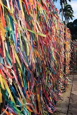 Fitinha do Senhor do Bonfim (English: Lord of Bonfim Ribbon) is a souvenir and popular amulet that can be found being sold by street vendors around the Church. The fashion accessory is made from cotton and has the phrase "Lembrança do Senhor do Bonfim da Bahia" (Remembrance of the Lord of Bonfim of Bahia). The term has religious connotations and refers to a representation of Jesus. The Fita do Senhor do Bonfim was worn by a supermodel in Milano, resulting in a cover page in Elle.[9]