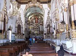 The interior decoration of the church was finished in the 19th century, and consists of a rich archive of painting, azulejos, gilded woodcarvings, and furniture. The nave has a single aisle. The church has six side altars; two on each of the lateral walls and two at the front of the nave. The Neoclassical main altarpiece, which has the form of a baldachin with a cupola sustained by volutes, was carved by the master sculptor Antônio Joaquim dos Santos between 1813 and 1814; he is likely also responsible for its design. The side altars have paintings by José Teófilo de Jesus (ca. 1758–1847) at center in place of the gilded wooden images of saints found in other churches of Bahia. The interior of the church has a great number of azulejos. There are 28 large-scale azulejo panels on the lateral walls of the church depicting the life of Christ. They were painted by Tomáz do Carmo in Lisbon in 1855. Similar panels of azulejos were ordered from Portugal in the same decade to decorate the sacristy, but were never installed. The nave and sacristy have plain azulejos. Between 1816 and 1817 Antônio de Santa Rosa carved the ceiling of the chancel, its tribunes, the chancel arch, and two side altars.[4][5]