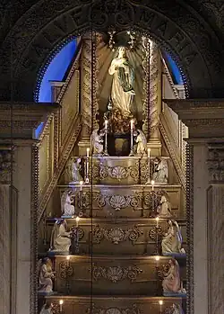 The chancel, bordered by a richly carved arch, includes tribunes, the celebration table, and behind it a large altar in a staircase leading up to the image of the patron saint at the top, housed in a niche with a baldachin. The bibliography mentions that formerly the image of Saint Joseph of the Good Death was under the table, but today it is next to the first side chapel on the right.[2]