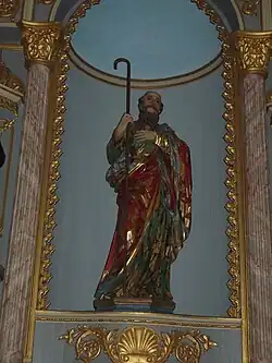 The entrance is protected by a carved and glazed parapet, forming a vestibule. The nave of the church has bare walls, but both the side altars and the lecterns have profuse decoration in carvings, gilding, and marbled painting. The six side altars are dedicated to the Sacred Heart, Saint Manuel, Saint Joachim, Our Lady of the Assumption, Saint Francis of Paola, and Saint Expedite.[8] Some of the images are of great expressiveness and plastic wealth, such as that of the patron saint, a beautiful production of Portuguese sculpture from the 18th century. Another of great beauty is that of Saint Joachim, with moving draperies and gold painting.[8]
