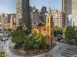 The Church of Our Lady of the Rosary of Black Men (Portuguese: Igreja Nossa Senhora do Rosário dos Homens Pretos) is located in Largo do Paiçandu, in the central zone of the Brazilian city of São Paulo. It was originally situated in Antônio Prado Square, where it was built by black workers at the beginning of the 18th century to serve as a meeting place for slaves who celebrated Catholic rites mixed with beliefs of Bantu origin. In 1903, as part of the urbanization process initiated by Mayor Antônio Prado, the old church was demolished and rebuilt where it stands today. The new temple was consecrated in 1906, when a large procession, accompanied by a band, carried the images from the old church.[1]
