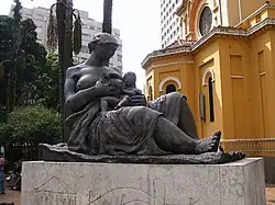 Next to the Church of Our Lady of the Rosary of Black Men, in Largo do Paiçandu, stands the statue of Mãe Preta, designed by Júlio Guerra. Sculpted in bronze in 1955, the monument synthesizes the traditional figure from the colonial period of the black mother who served as a wet nurse for the children of her mistress or employer. Due to its strong imagery related to the mother, the statue is worshipped by a portion of the population, and it is common for flowers and candles to be placed next to the statue's granite pedestal. A railing was recently placed around the base to protect the image from darkening by candle smoke.[20][21]