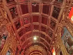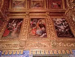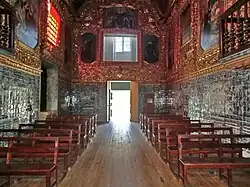 Presenting a somber facade, the simple rectangular church has a sacristy along the axis of the presbytery.[2] Its interior walls and ceiling are covered with ornate gilded woodwork in proto-Baroque, Baroque and Rococo architectural styles,[2] and framing a number of paintings, including depictions of the lives of Mary (in the presbytery), Christ (on the ceiling), and Saint Teresa of Ávila (along the nave). Halfway up the walls is blue and white azulejo tile attributed to 18th century artisan António Vital Rifarto of Coimbra, who was also designed the ceiling's gilded woodwork.[2][7]