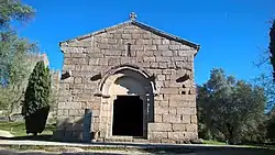 The longitudinal church existing of a single rectangular nave and chancel, is built on staggered horizontal spaces covered in a tiled-roof.[2] The walls are constructed in granite blocks topped by gables, while the lateral walls support double eaves.[1] The main facade with portico with interrupted lintel includes a double arch with simple tympanum. The archway is flanked by beams supporting the main body, while a slit window surmounts the entrance and a cross fleury at the apex of its frontispiece.[1] The lateral southern and northern walls are accessible by doors with lintels, and surmounted by demarcated arch with complementary beams and slit windows (as in the facade, but less grand).[1]