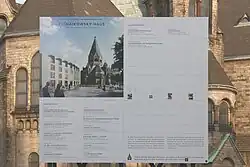 Construction board for Tschaikowkskyhaus against backdrop of church