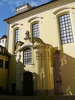 Church of Saint Michael the Archangel (Czech: Kostel svatého Michaela archanděla) is a church situated in Prague, Czech Republic. It was built in Romanesque and Gothic style and later rebuilt in Baroque style. The priest and church reformer Jan Hus celebrated masses in the church. The church and adjacent monastery were disestablished during the reforms of the Emperor Joseph II in the 18th century. Later, the buildings served as a warehouse. In the crypt, there are buried rectors of the Prague's University.
