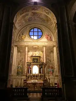 Of the church's interior furnishings, the only item surviving into the 21st century is a 1490 altarpiece consisting of three panels, created by Giampietrino. Originally placed in the right apse of the old temple,.[14] it now lacks its central section, which depicted a Madonna and Child, replaced by a wooden statue of the Immaculate Conception crushing the serpent. It is preserved in the Chapel of the Immaculate in the Basilica of San Magno[14]