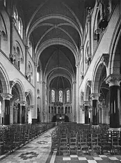 The church is built in a Latin Cross plan with a central nave and two aisles, cut by a small transept. The nave on three levels is divided in four spans by two times three monolithic barrelled columns of polished Labrador granite. The capitals, made of white Euville stone, are all decorated with different motifs. The choir ends in a semi-circular apse under a five-sided arch. The back of the church also forms a semi-circular apse, inspired by the style of the Romanesque churches of the Rhine region.