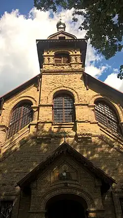 The church in Zabłocie was constructed from brick and follows a rectangular plan. Its architecture bears resemblance to Roman Catholic churches being built around the same period, but it also displays elements typical of Russian Revival architecture, the art of Podlachia,[1] and wooden church buildings from the Russian North.[12] The church is a single-nave, single-dome structure with a bell tower located above the church porch. The roof is covered with tiles.[1] The building is divided into three parts, each placed along the longitudinal axis and covered with separate roofs. The chancel consists of two rectangular sections, the nave is square, and the church porch is rectangular. Above the nave, there is a square belfry topped with an onion dome. The bell tower is also crowned with an onion dome, set on a tented roof.[12] The narrow bell tower, the thick columns at the entrance, and the decorative arch-shaped ornaments are elements borrowed from 19th-century Russian brick church architecture. The church in Zabłocie stands out from other Orthodox churches built in the Chełm Land in the first decade of the 20th century. Some features, such as the narrow bell tower and gabled roofs, can be seen in other regional churches from the same period, such as those in Mszanna, Łaziska, and Drelów.[12]