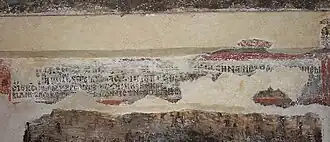 The founder's inscription was written on the inner western wall of the nave, above the entrance to the church, covering the entire width of the lintel. The text of the inscription is written in four lines on a white background in black letters of unequal size. The text begins with the trinity invocation in Church Slavonic language: “Izvolenijem Otca I savršenijem Sina I sapospešenijem”, common to founding inscriptions of Serbs and Bulgarians in the Middle Ages. At the very beginning, the first word was preceded by a small painted cross, partially preserved (Latin invocatio symbolica), which usually began and ended inscriptions of this type in the Middle Ages. Unusually, a mention of the Bulgarian Emperor also mentions the name of the Vidin master Balaur. The label reveals that Balaur was co-ruler, which is important proof of his real power within the Bulgarian elite.[8]