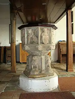 The 15th century octagonal font has panels which alternately depict lions and angels. The Angels are carrying a shield which depicts a leopard. This was derived from Jermy Coat of Arms. Sir John Jermy (b. 1375) was Lord of the Manor and fought at the Battle of Agincourt.[4]