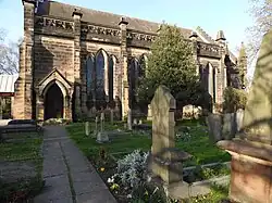 When the spire of Holy Trinity Church, Trinity Square was removed by October 1942[1] stones from the spire were used in the new drive at St John's when the entrance from Mansfield Road was walled up and a new drive created from Church Drive. Other stones were incorporated into a wall on the Carrington Lido side of the churchyard.[2]