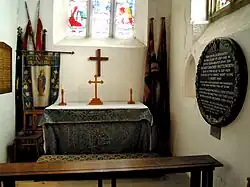 In 2008, after changes in the status of the Shuttleworth Chapel in Old Warden Park, St Leonard's church received a number of items from the chapel, including two flags, two lances with regimental pennants, linen and lace altar cloths, a wooden cross and candlesticks. With these items also came the oval plaque with the Shuttleworth family crest and RAF wings dedicated to Richard Ormonde Shuttleworth (1909-1940), who was killed in a flying accident while on active service during World War II and who is buried in the churchyard. This plaque has been placed in the Chapel, in the south nave part of the church.[4]
