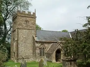 The hamstone building has slate roofs.[1] It is 57 feet (17 m) long and consists of a three-bay nave and two-bay chancel.[1][2] The 40 feet (12 m) high two-stage tower is supported by buttresses.[1][2]