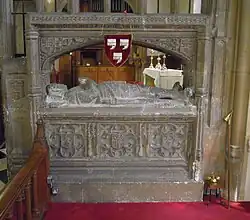 His recumbent effigy is shown fully armed in a suit of Almain rivets and his feet rest on a dog. His hair is of chin-length and his hands are clasped in prayer holding a ball shaped object, his heart according to Roger Granville, Rector of Bideford and the family's historian, who described the monument in detail in 1895.[9]