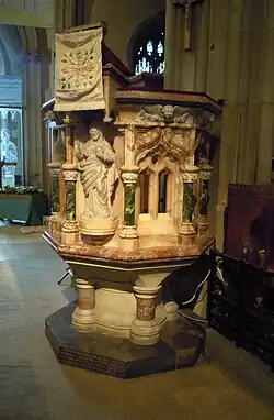 The pulpit dates to 1894 and is made of white marble veined with orange, green and red from Ashburton in south Devon and was carved by Devon craftsmen with attached columns and a figure of Christ.[1] To the right of the altar is the chest tomb of Sir Thomas Grenville, who died in 1513. The Grenvilles were patrons of the living of Bideford for several centuries. The tomb is of quatrefoil panels carrying a recumbent figure in armour; it and the tracery surrounding it are in approximately the same position as they were in the Norman church. Inscribed on the Tudor arch above is the following Latin text: