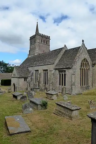 The church is built of Cotswold stone.[2] It consists of a four-bay nave with clerestory, chancel, south aisle and chapel and has both north and south porches. The six-stage west tower is supported by diagonal buttresses,[1] and includes a bell dating from the 14th century.[2]