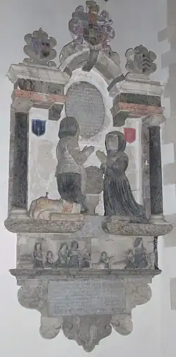 Nearby is the mural monument to Anthony Dennis (died 1641) of Orleigh Court and his second wife Gertrude Grenville flanked by Ionic columns. Beneath them are figures of his eleven children, eight of whom are kneeling and three lying down, indicating their deaths in infancy. The tablet was erected in 1643.