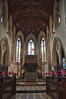 The church is built of coursed sandstone rubble with ashlar dressings. The nave has aisles and a clerestory; there are north and south transepts and an apsidal chancel. Original features include the altar rail, choir stalls, chancel screen, stone pulpit and tiled floors; also the limestone font which has a tall oak cover. There is stained glass by Hardman & Co. The organ by Henry Willis & Sons, replacing an earlier organ, was installed in 1873.[2][4][7]