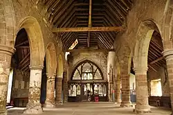 The interior is "a shock to the modern visitor who encounters an uncluttered medieval interior dominated by the arcades and roof".[5] The unfurnished nave demonstrates the "strong early thirteenth century arcades to the full".[6] The architectural historian John Newman describes the font as "a strange piece, an octagonal bowl with a thick circular stem".[6] The choir stalls and the pulpit are 19th century.[6] A stained-glass window in the chancel commemorates John Etherington Welch Rolls.[6] In the transept is an unfinished memorial to a knight, dating from the late 13th or early 14th century, "a rare survival of great technical interest".[6]