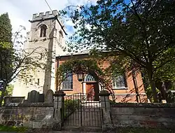 In 1782 the medieval nave, chancel, porch and south aisle were demolished.[1] The remaining west tower and north aisle were added to with a red brick wide square nave and polygonal chancel that ends in an apse. Some of the stone from the demolished building was used in the new part of the church as a wall between the nave and chancel. The new part of the church was built higher than the older part with steps leading down to the medieval north aisle. The small vestry window in the north aisle was created from a doorway in the original church. The four bells were recast in 1923 and two bells were added in 1928.[4] A further two bells were added in 1999 to make a ring of eight bells with tenor weight of eight and three quarter hundredweight.[5]
