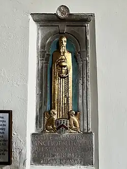 Inside the church is a memorial to Lancelot Mitchell Priest and Rector 1905 - 1937. The statue is of Melchizedek, representing priesthood. It was designed by Holland W. Hobbiss, sculpted by William Bloye, and installed in 1950.[8]