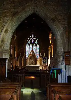 The chancel dates to the 13th century; the sedile has a ogee-headed arch. The stone reredos, the design of Edward Browning, incorporates a marble relief by Mario Raggi; it was placed in the chancel in 1881 in memory of former rector, William Belgrave.[6] The stained glass in the east window is by Alfred Gérente (1856).