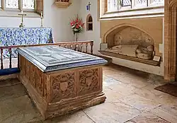 The lead roof of the chancel was reported to be in ruins by 1636; the discovery of a lead-lined tomb in the church saw it reappropriated for the purposes of renewing the roof. Damage to the windows of the chancel and north nave aisle by Parliamentary troops in 1644 caused the loss of most of the medieval glass and the destruction of the organ. The organ was not renewed until 1715.[4]