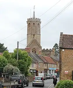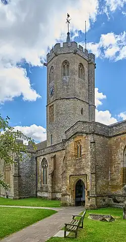 Situated on a small hill, the highest point of the village, the church is a significant landmark in the local area. The chief external feature is the tall but irregular octagonal crossing tower, reputed to be the tallest example of such a structure in the country. The tower is 21 feet (6.4 m) wide east-west,[9] though less so from north to south, as noted by Pevsner. The tower has two external stages above the roofline, with string courses, battlemented parapets and angle gargoyles. There is a stair turret rising the full height of the tower in the southwest corner. The tower is topped by a small lead-covered spirelet and wrought-iron weathervane.[1]