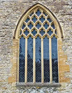 The north transept, of two bays, has angled corner buttresses and a battlemented parapet. The transept has two five-light windows, that of the north face being of the reticulated traceried design; the window in the east face is flat-arched, also with reticulated tracery. The south transept is one bay, and has a similar design to the chancel, with chamfered plinths, simple parapet and full-height corner buttresses.[1][6]