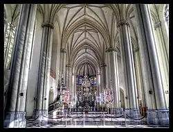The church was built by the Latin Archbishop of Lviv, Józef Bilczewski in the years 1903–1911 as a parish church for the city's dynamically developing western suburb. It was designed by Polish architect Teodor Talowski,[1] in the neo-Gothic style, similar to that of the Votive Church in Vienna. St. Elisabeth's, placed on a hill which is the watershed of the Baltic and Black Sea, with its facade flanked by two tall towers and an 85 m belfry on the north side with imposing spires was envisioned as Lviv's first landmark to greet visitors arriving in the city by train.