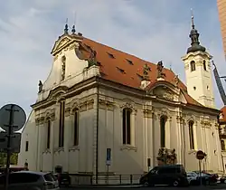 The Church of Sts. Simon and Jude (Czech: Kostel svatého Šimona a Judy), situated next to the Brutalist Hotel InterContinental on U Milosrdných Street in the Old Town of Prague, dates back to 1354, when a hospital was founded on the site. The building was adjoined by a chapel that was sanctified by bishop Arnošt of Pardubice, a close friend of Emperor Charles IV.[1]