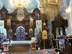Inside, there is a two-tiered iconostasis made of oak wood with gilding. The icons within it were painted by the St. Petersburg iconographer Silayev. He also created the images of saints located in the altar room in oak icon cases.[3] The church also houses four older icons from the turn of the 18th and 19th centuries: two images of Mary (one transferred from the church in Tyszowce, demolished in 1958) and depictions of the Dormition of the Mother of God and Christ the Good Shepherd. Another piece of equipment older than the church itself is the altar cross from the first half of the 19th century.[21]