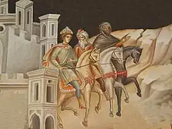 The section that was a mosque is held up by oak pilasters, placed into the walls outside and free-standing inside.[2] The ceiling is decorated with wooden beams in Oriental style.[1] Its central portion was covered in stucco at some point, with the figure of Christ Pantocrator painted in the middle of the ceiling, as is customary.[2] The iconostasis features a silver-gilt icon of the Archangel Michael, in a wooden frame. This was executed in Russia and given as a gift by Grand Duke Michael in 1834, along with a number of leather-bound religious books written in Old Church Slavonic.[1] The icon was stolen at the beginning of the 20th century but recovered by the police. Initially dedicated to Michael alone, the name of the Archangel Gabriel was added to the church later.[3]